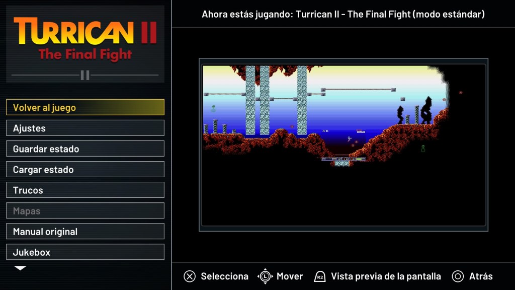 En términos llanos Turrican es un run-and-gun cuasi scroller, se dispara y se salta sobre los enemigos, hay que avanzar hacía derecha de cuadro, aunque es posible regresar, a diferencia de otros scrollers, de hecho es un mapa relativamente amplio para el estilo de juego, ¿Se acuerdan de esas guías de… Metroid, digamos? Creo que no, bueno: en las revistas de videojuegos de la época, era común ver unas imágenes similares al corte de una madriguera de roedores subterráneos; pasajes y túneles que de repente se abrían hacia el cielo o podía seguir por largas distancias en dirección horizontal. En el caso de Turrican el camino se presentaba de manera abierta y no requería que la pantalla se trasladará, como en Contra por ejemplo, que sufriamos de un ligero mareos con esos paneos. En el caso de Turrican Anthology la resolución puede regularse en los ajustes de video para verse en pantalla completa o a su resolución original de 8 bits.