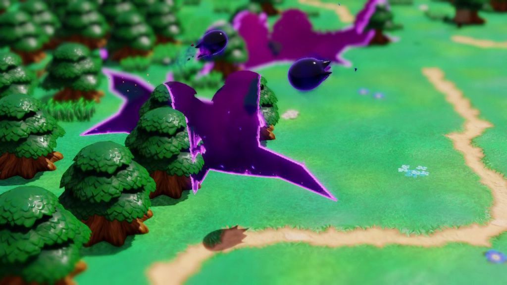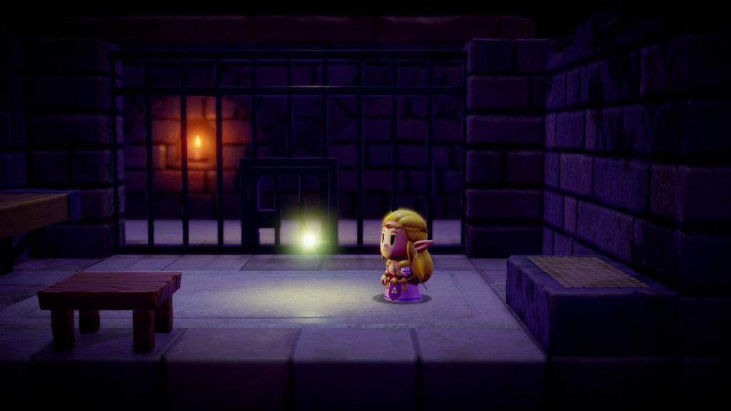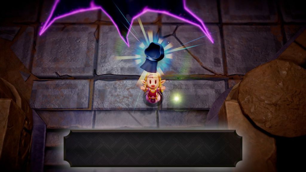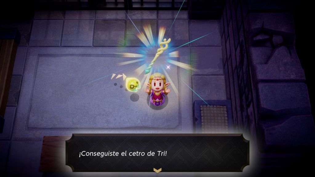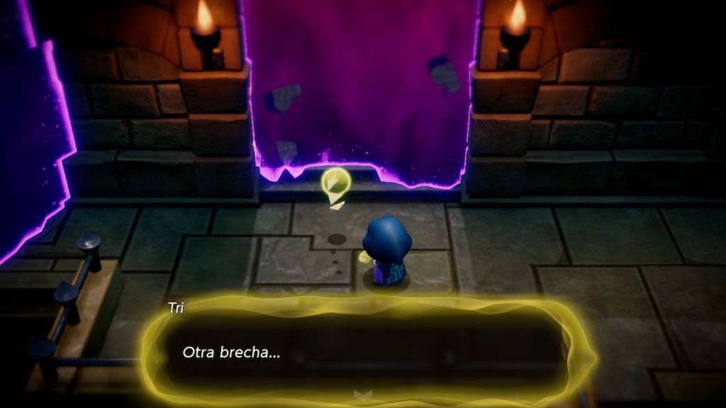 En una triste mazmorra, enclaustrada–de nuevo–se cuestiona, como la huida emprender, de pronto, ante sus ojos un fuego fatuo ve encender: Tri es mi nombre-se presenta-qué busca de su ayuda con una aciaga empresa. Sus compañeros deben ser salvados, la brecha los tiene prisioneros junto al reino de Hyrule del que solo quedan restos. Tri le entrega un báculo encantado, con él podrá crear copias fieles de objetos o convertir enemigos en vasallos pero por tiempo limitado. Con esta magia podrá vencer las pruebas y en cada oscuro rincón caminos iluminar. Tri ayuda con objetos mover y trampillas activar en las ominosas mazmorras en las que Zelda andará.