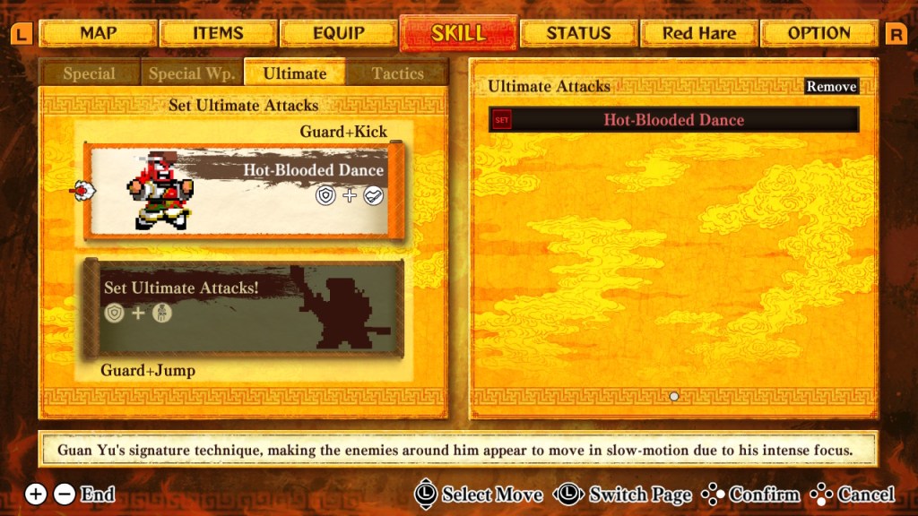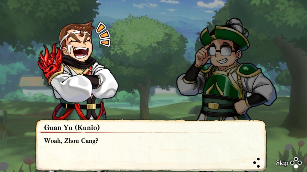 El gameplay es muy peculiar puesto que mantiene los conceptos básicos de los beat ‘em up que ya conocemos, es decir nuestro personaje se mueve en un espacio, tiene que derrotar a sus contrincantes con puños, patadas y combinaciones de golpes. Recoger armas que se encuentren y utilizarlas para defender o atacar. Pero la diferencia es que three kingdoms agrega un elemento de RPG con mecánicas de progresión y experiencia. Guan Yu/Kunio no sabrá magia pero aprenderá movimientos especiales y golpes finales; reacomodar puntos para mejorar sus cualidades y habilidades; comprar y vender objetos o alimentos, estos últimos sirven para mejorar la salud, otros objetos otorgan poder, otros son simplemente estéticos.Hay otros detalles como la introducción de una motocicleta lo que hace de este elemento algo ligeramente anacrónico aunque es más como un objeto alegórico, una montura para desplazarse entre escenarios.
