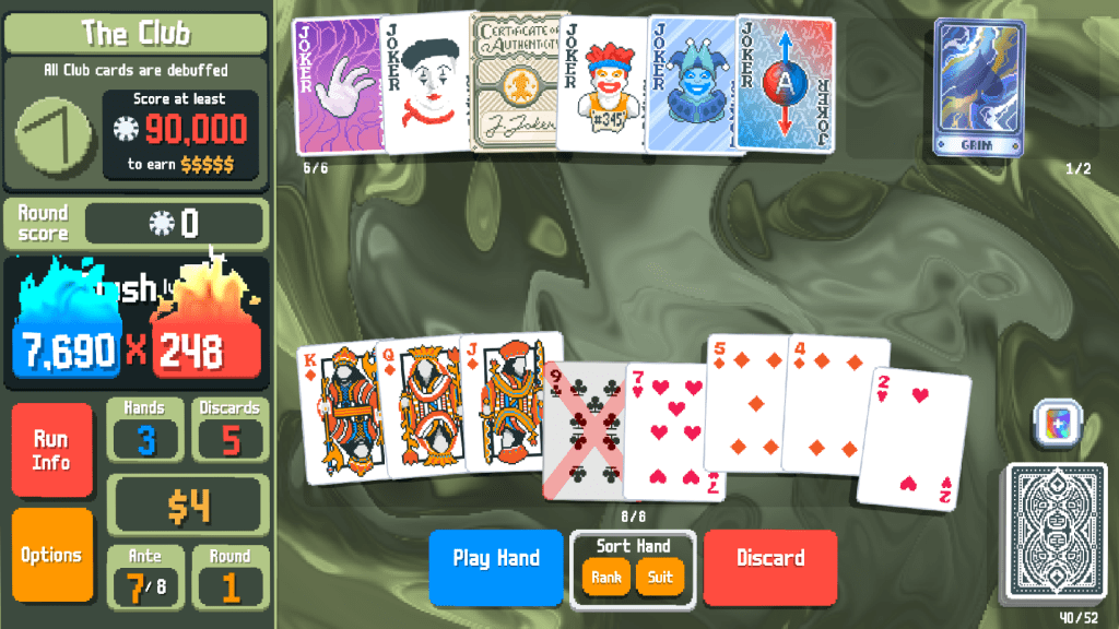 Aquí es donde entra la ya mencionada regla de oro: cuando una carta contradice las reglas, SIEMPRE gana la carta. Balatro se luce en este sentido: hay jokers o comodines-no confundir con “El Bromas”-que modifican tus jugadas: las figuras cuentan el doble, los tréboles suman puntos extra, los números de la serie de Fibonacci te dan multiplicadores adicionales y un largo etcétera; cartas del Tarot que modifican tus cartas individualmente: agregan puntos o multiplicadores, contadores que te dan recursos o cambian el palo o número de las cartas; y cartas de planetas que mejoran el nivel de las jugadas. De esta manera, y antes de darte cuenta, puedes lograr que un humilde par de cuatros sume más de cinco mil puntos.