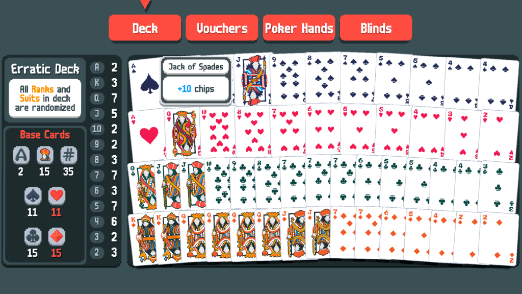 Balatro inicia con una típica baraja inglesa de 54 cartas repartidas en los 4 palos usuales: diamantes, corazones, picas y tréboles. Con estas cartas debes formar manos de póker (carta más alta, par, dos pares, tercia, escalera, color, full house, póker y escalera de color) las cuales te darán puntos según el número de cada carta y este palo se multiplicarán de acuerdo a la mano jugada. El objetivo es superar una ciega, es decir, alcanzar un puntaje que se va incrementando en cada round.