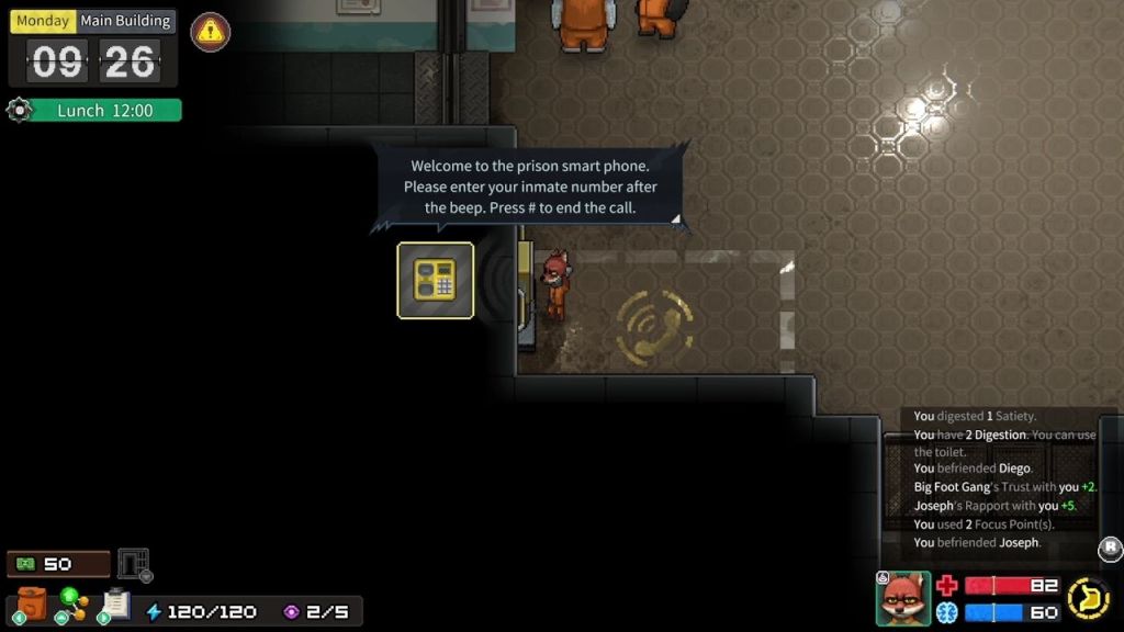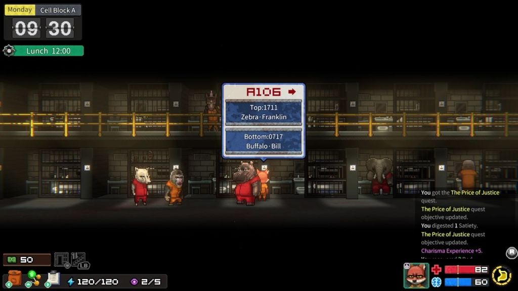 Independientemente del personaje que elijas, tendrás un tiempo límite de 20 días (en el tiempo del juego) para lograr completar tus objetivos. Y además, deberás llevar el ritmo de los días de encierro: pase de lista, horario laboral, comida, tiempo de esparcimiento, noche (bastante animada, por cierto, con peleas de box entre reclusos o sesiones de películas) y el encierro hasta el día siguiente. Seguir esta rutina puede ser algo desesperante para algunos, junto con la gestión de recursos (stamina y salud tanto física como mental, ida al baño incluida) que nunca ha sido mi favorito.