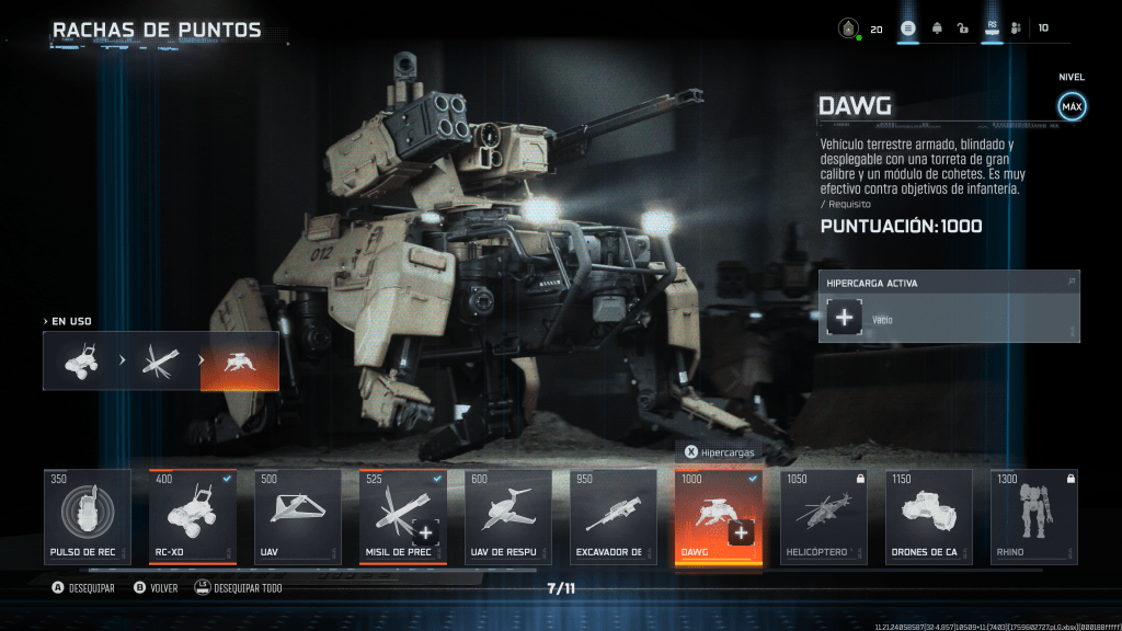 Finalmente, tenemos las rachas de puntos, las cuales también sufrieron modificaciones contextuales. Nos llamó la atención el misil de precisión completamente automático. Aunque la estrella de las rachas fue D.A.W.G. (Deployable Armored Weaponized Groundcraft), un robot cuadrúpedo artillado completamente automatizado, pues no requiere órdenes y reconoce amenazas de manera autónoma.