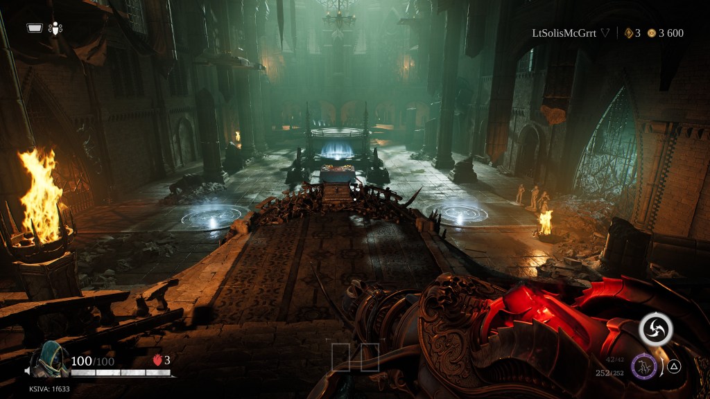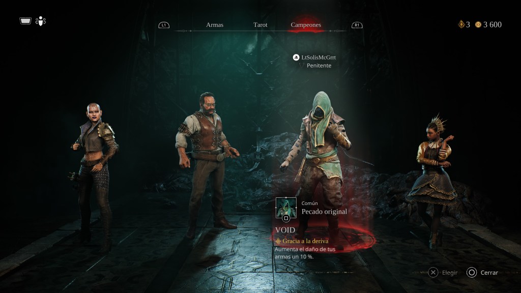 Otro elemento importante son las tarjetas del tarot, que funcionan como potenciadores: aumentan el daño, aceleran la regeneración de salud, entre otros efectos. Tanto las cartas como el desbloqueo y progresión de armas se compran con monedas de oro y destellos de almas, estos últimos otorgados según nuestro desempeño en las incursiones. Tenemos tres oportunidades para superar cada escenario; los compañeros pueden revivirnos, pero al costo de una de esas tres vidas. Salud y munición se encuentran repartidas por los claustros o al derrotar enemigos.