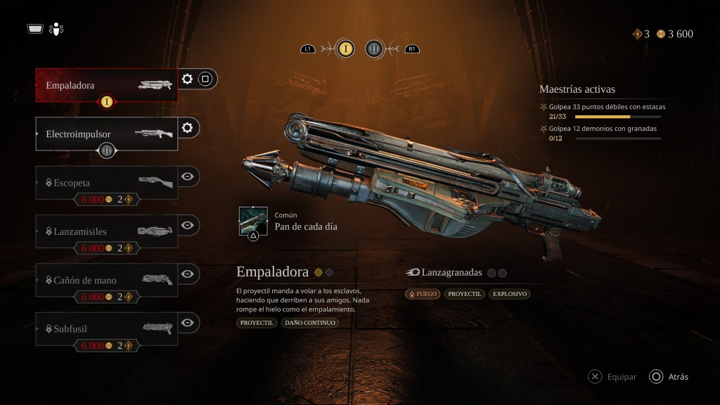 Los movimientos permiten desplazarse entre secciones y descubrir nuevas áreas. El arma principal es un clásico de la franquicia: la Painkiller, un aparato con tres hojas afiladas que giran a toda velocidad, destrozando todo a su paso. Además, tiene un gancho para desplazarse, activado con R1 cuando esté disponible. Para usar el arma, se presiona L3. Esta es la base del arsenal, pero también hay subfusiles, escopetas, lanzacohetes, lanzadores de hojas de sierra o, como diría Jean Baptiste Zord, mi favorita: el empalador, un lanzador de estacas que deja a los enemigos ensartados en la pared.
