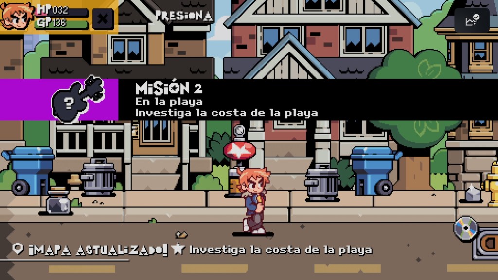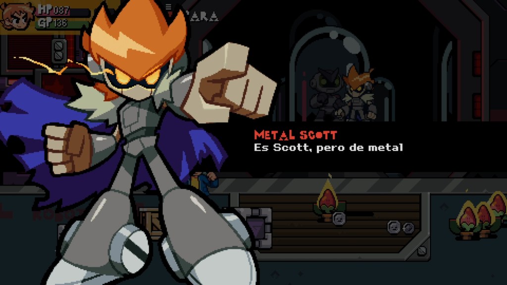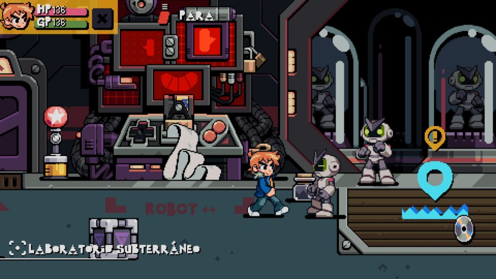 Con una estética de pixel art, el juego resulta muy visual en cuanto a personajes y pandillas, completamente basado en la novela gráfica y con las vibras que lo hacen especial. Las referencias a videojuegos clásicos son constantes: caparazones de tortuga que funcionan como armas al ser pateados, escenarios con imágenes de consolas retro, enemigos que recuerdan a Mega Man, checkpoints similares a los de Sonic… en fin, una plétora de guiños a los géneros que abarca el título y un homenaje a la era dorada de los videojuegos.